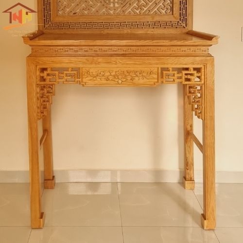 Bàn gia tiên – bàn thờ gỗ sồi thờ cúng mẫu hoa sen tượng trưng cho vẻ đẹp thanh tao