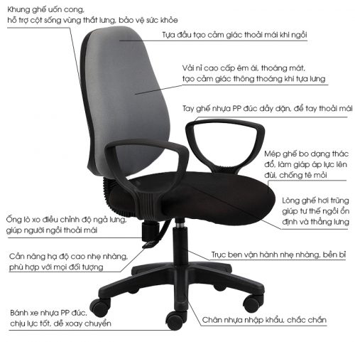 Ghế văn phòng TP-GVP01 có thiết kế rộng rãi giúp nâng đỡ toàn bộ cột sống, tạo tư thế ngồi thoải mái đồng thời giảm áp lực lên đùi, giúp lưu thông máu tốt. Khung ghế được làm bằng nhựa cứng cáp cấu tạo vững chắc, có khả năng chịu được trọng lượng cao và chịu sự tác động của lực rất tốt, đảm bảo độ bền sử dụng lâu dài theo thời gian. Lưng ghế thoáng mát được thiết kế đặc biệt để hỗ trợ cột sống vùng lưng, cổ, bảo vệ sức khỏe.